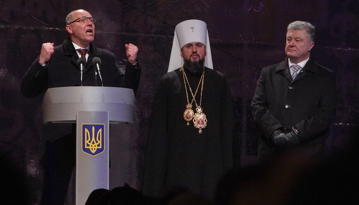 Президент Петро Порошенко, спікер Верховної Ради Андрій Парубій та «митрополит» Епіфаній
