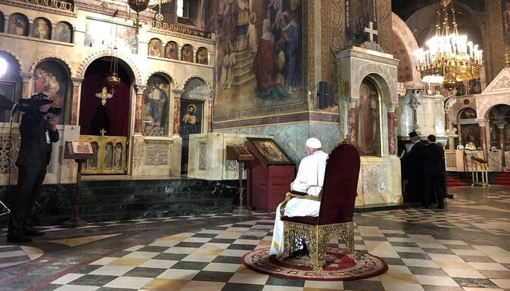 папа Франциск посидел несколько минут в полной тишине в кресле в кафедральном соборе Софии