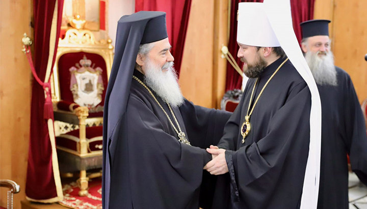 Предстоятель Єрусалимської Православної Церкви Патріарх Феофіл III і митрополит Волоколамський Іларіон (Алфєєв). Фото: mospat.ru