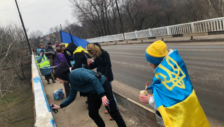 Волонтер Олена «Десюшка» розповіла, що в пам'ять про себе активісти вирішили «трохи пофарбувати» міст у кольори українського прапора. Що активісти, обернувшись прапорами, і зробили.