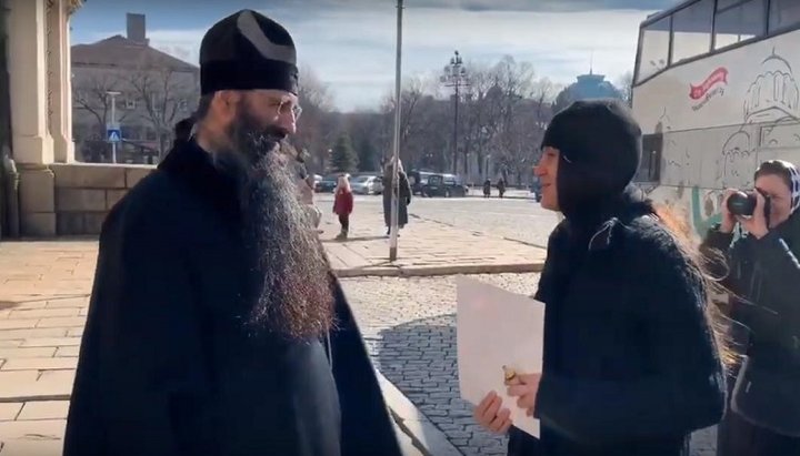 Зустріч владики Варсонофія і парафіянки кафедрального собору БПЦ в Софії. Фото: скріншот відео, YouTube-канал Вінницької єпархії УПЦ