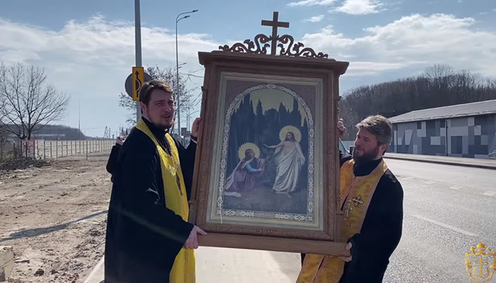 Священнослужителі з іконою святої рівноапостольної Марії Магдалини. Фото: скріншот відео на каналі Вінницької єпархії УПЦ в YouTube