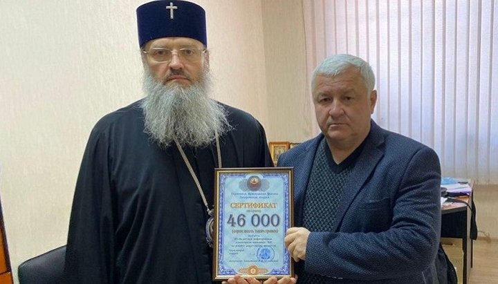 Митрополит Лука передав сертифікат на суму 46 тис. грн головлікарю лікарні В. Шинкаренку. Фото: Telegram-канал Лекарь.zp