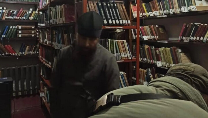 На фото з місця подій видно, що обшуки відбуваються, судячи з усього, в семінарській бібліотеці, дві книги з бібліотечними формулярами – російською мовою.