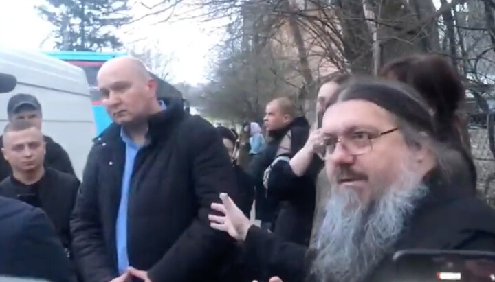 Єпископ Никита (праворуч) та чиновник, який перешкоджає паломництву в Почаїв. Фото: t.me/orthobuk