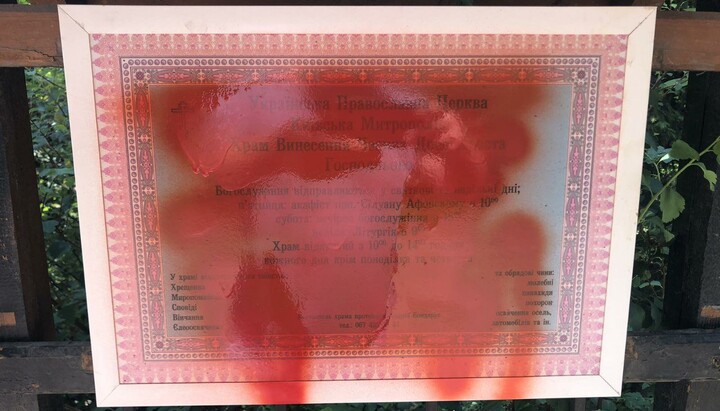 Канал опублікував фотографії, на яких видно, що вандали вимазали червоною рідиною табличку біля храму з розкладом богослужінь та написали на тротуарі біля церкви лайки на адресу віруючих і побажання «здохнути».