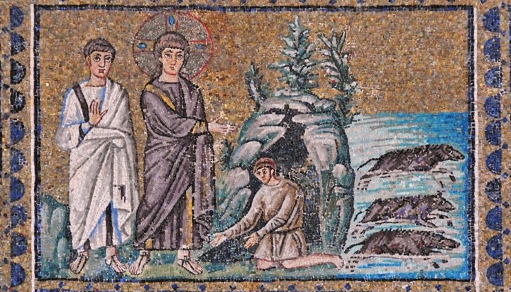 Зцілення гадаринського біснуватого (Лк. 8, 26-35). Мозаїка. VI ст.; Італія. Равенна. Базиліка Сант-Аполлінарія-Нуово. Фото: ruicon.ru