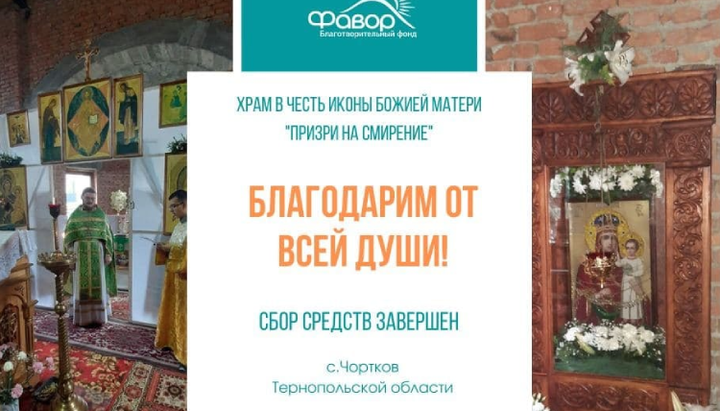 Необхідна сума для допомоги православній громаді храму УПЦ на честь ікони Божої Матері «Призри на смирення» у м. Чортків Тернопільської області зібрана, повідомили на Facebook-сторцнці БФ «Фавор».