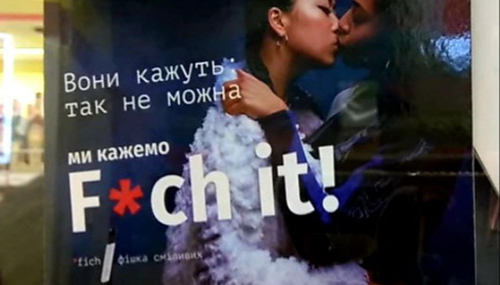 В одному з київських супермаркетів журналісти зафіксували рекламу електронних сигарет, в якій пропагувалися ЛГБТ-цінності. На рекламі зображено пара дівчат, що цілуються, і напис: «Вони кажуть: так не можна, ми говоримо: До біса все це!», повідомляє youtube-канал «Перший Козацький».