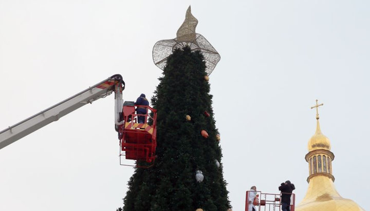 Монтаж капелюха на ялинці в Києві. Фото: radiosvoboda.org