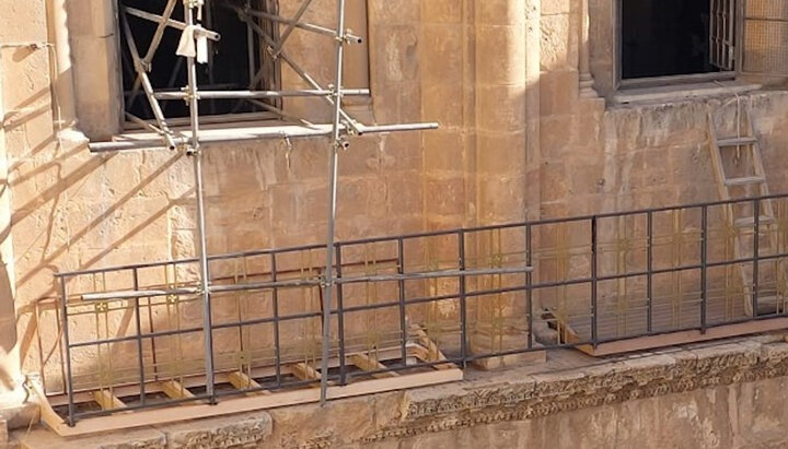 Старший Ключник Пресвятого Гробу архієпископ Ієрапольський Ісидор побачив це і закликав робітників зупинитися. Оскільки на своє прохання він отримав відмову, то подзвонив у поліцію. Представники органів правопорядку змусили робочих припинити встановлення поручнів.