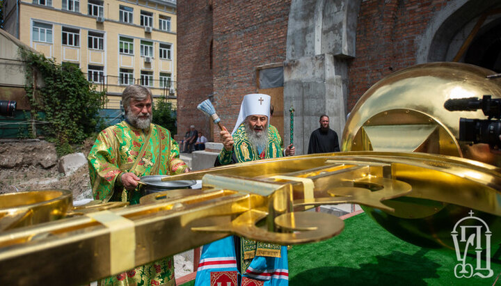 Освячення накупольних хрестів відроджуваного Троїцького храму в Києві. Фото: news.church.ua