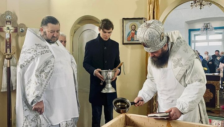 Архієпископ Боголєп освячує престол Свято-Михайлівського храму у Водяному. Фото: сторінка Олександрійської єпархії УПЦ в Facebook.