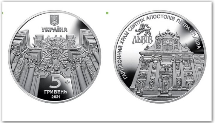 Національний банк України вводить в обіг пам'ятну монету номіналом п'ять гривень «Гарнізонний храм святих апостолів Петра і Павла (м. Львів)» із серії «Пам'ятки архітектури України», повідомляє прес-служба НБУ.