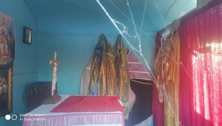 На фото видно, що будівництво занедбане, але за контурами помітно, що зводили церкву. При цьому поруч стоїть тимчасовий «храм» ПЦУ із будівельного вагончика з престолом та іконостасом.