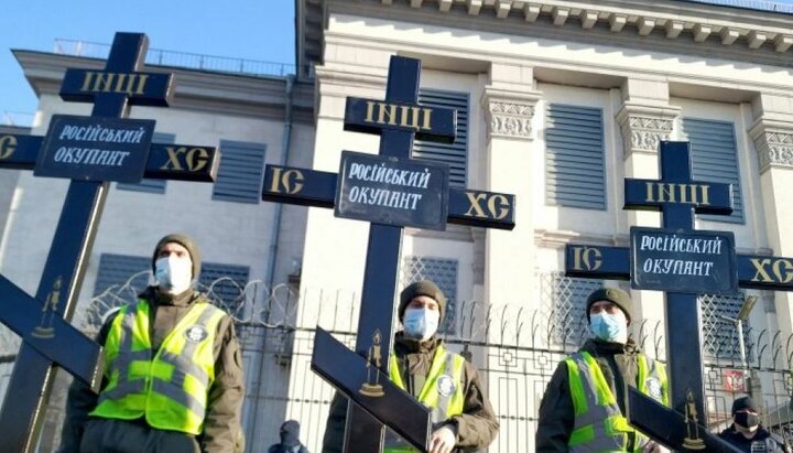 22 лютого націоналісти провели мітинг під стінами посольства РФ у Києві, під час якого встановили могильні хрести. Разом із християнською символікою використовувалися саморобні банери зі стандартними гаслами та лайками.