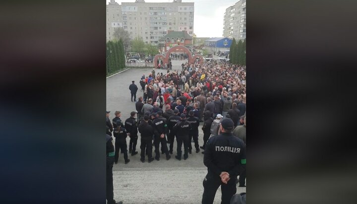 Прихильники «переходу» зібралися на площі перед храмом, тоді як священники, віряни та парафіяни храму стояли на паперті з іконами та корогвами. Ті, хто зібрався, співали патріотичні пісні, вигукували «Геть московського попа!» і «ганьба», тоді як віряни співали Великодні піснеспіви і молилися.