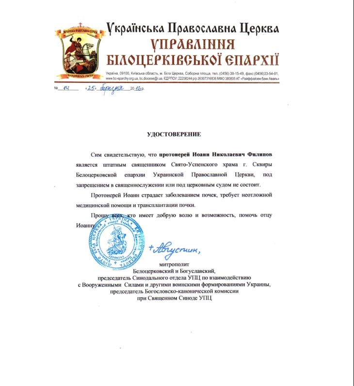 Протоієрей Іоанн Філіпов – клірик Білоцерківської єпархії, священик Успенського храму міста Сквири Київської області. Незважаючи на свою хворобу, отець Іоанн продовжує служити, при цьому тричі на тиждень їздить на гемодіаліз.