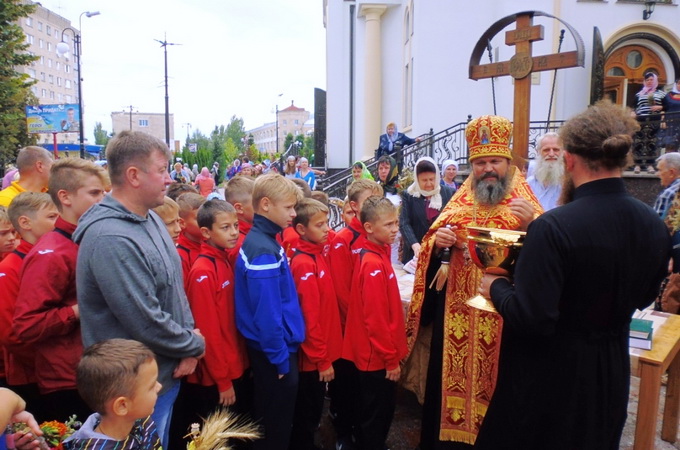 У дворі церкви їх зустріли та привітали настоятель протоієрей Євген Назаренко та ктитор храму Євген Степанович Бахмач. Після пастирської настанови отець Євген окропив святою водою футболістів, тренера та їх батьків.