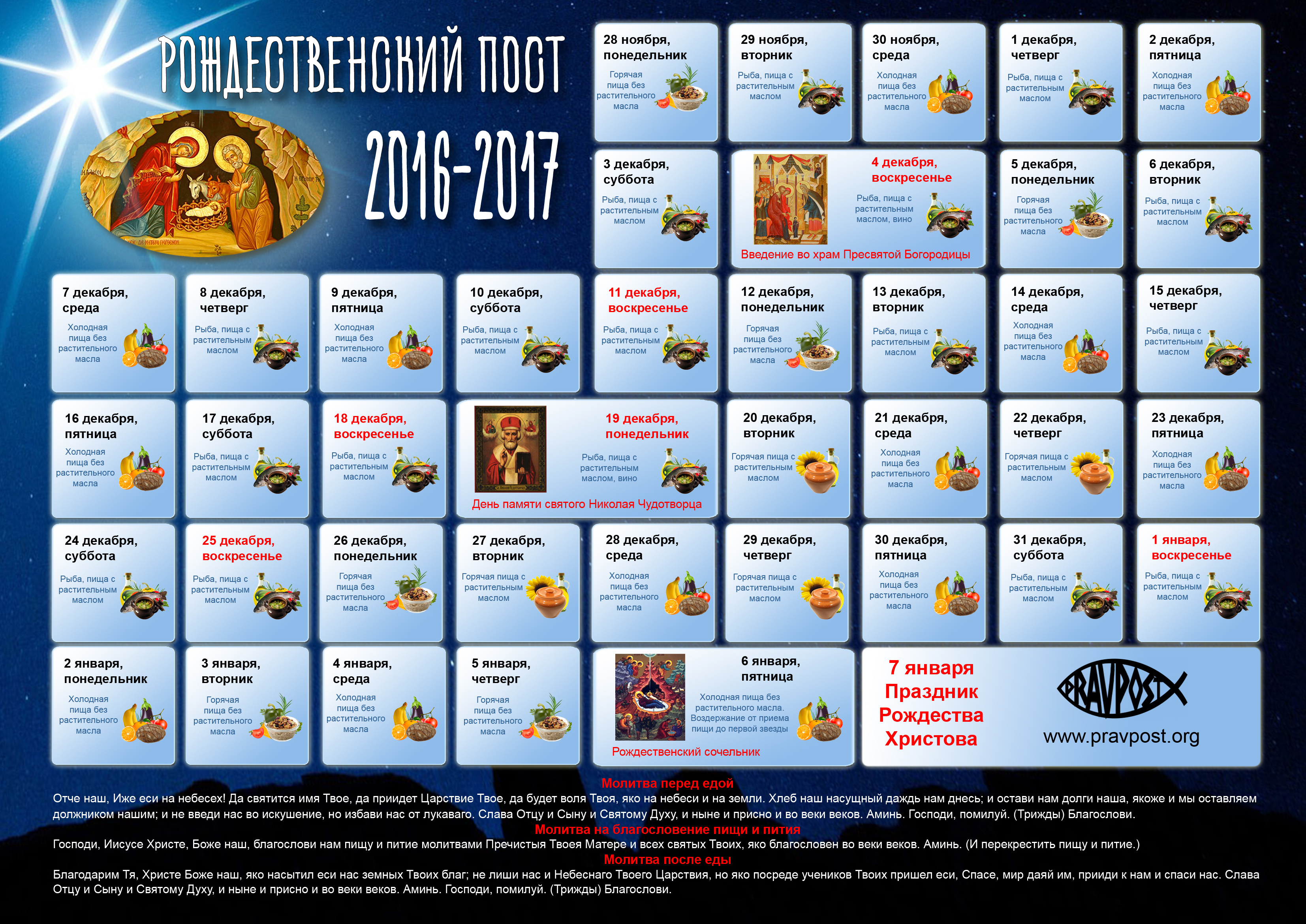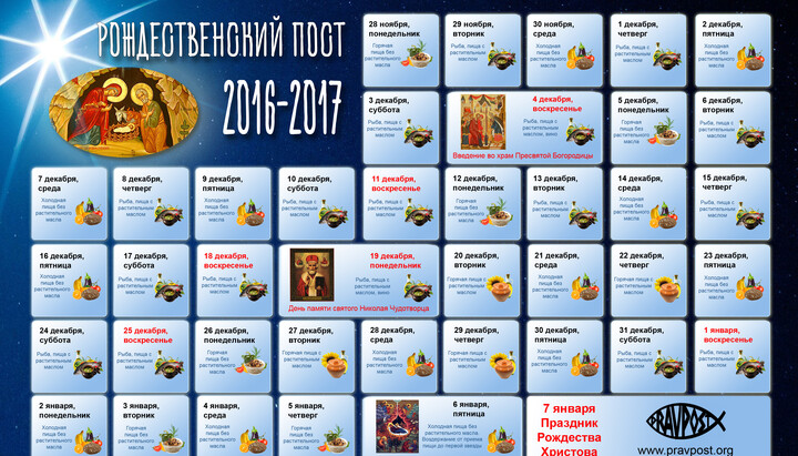 Згідно з церковним уставом, у всі дні посту з раціону виключаються м'ясні, молочні продукти та яйця. По понеділках, середах і п'ятницях дозволено вживати рослинну їжу без олії, а у вівторки та четверги – рослинну їжу з олією. По суботах, неділях та на великі свята до 2 січня дозволяється вживати рибу. Після 2 січня піст посилюється, та рибні продукти не вживаються.