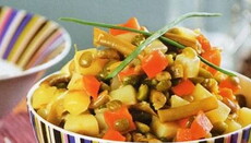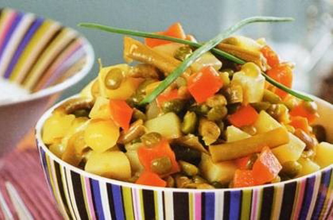 З'єднати у великій мисці картоплю, моркву, квасолю, горошок, нарізані кільцями оливки без кісточок та нарізану кубиками цибулину.