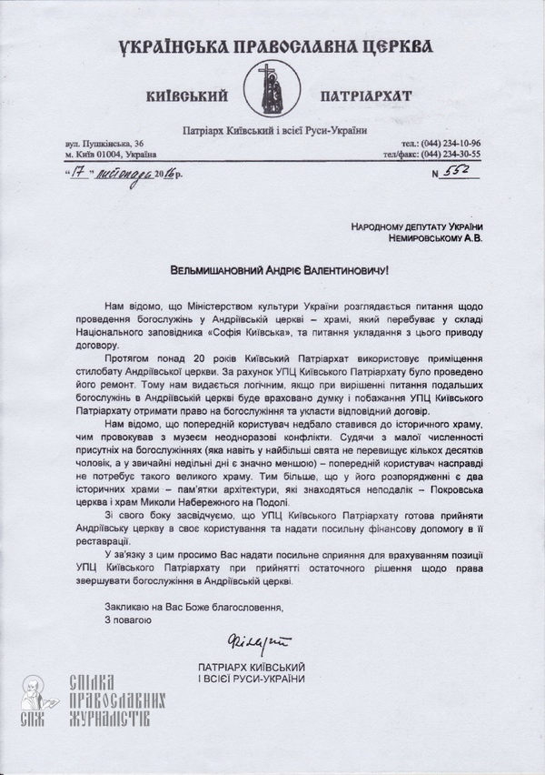 Філарет просить депутатів допомогти відібрати Андріївську церкву в УАПЦ