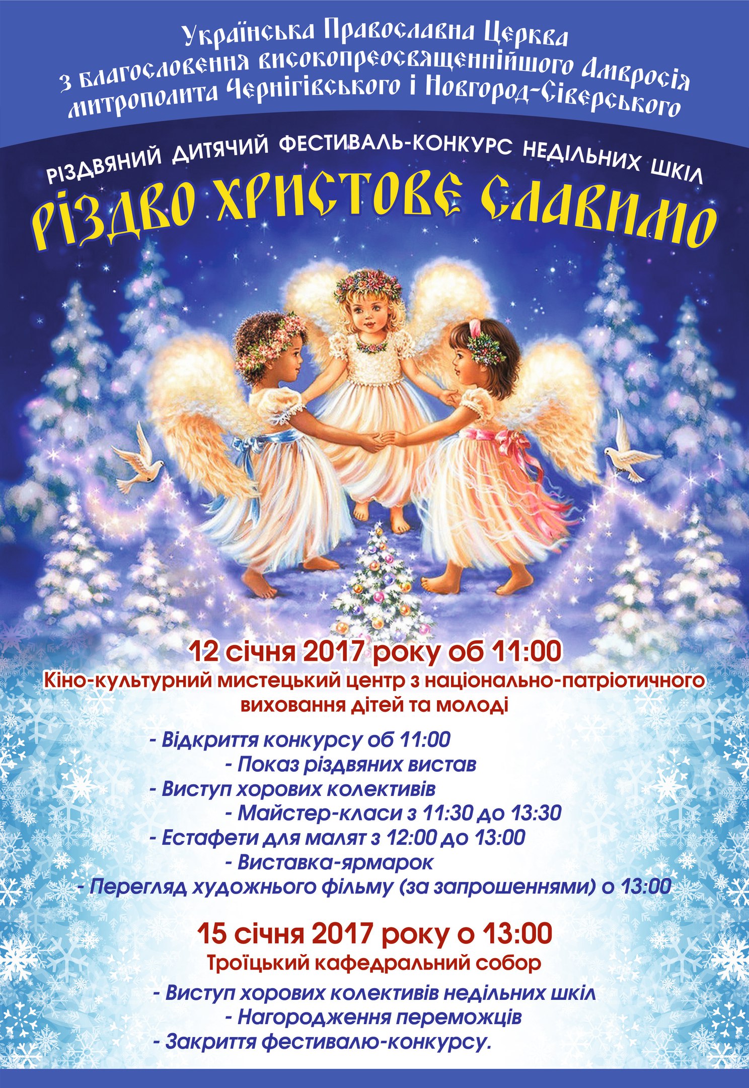 У Чернігові з 12 по 15 січня проведуть Різдвяний дитячий фестиваль-конкурс недільних шкіл. У програмі – показ тематичних вистав, виступ хорів, майстер-класи, естафети, виставка-ярмарок та перегляд художнього фільму. Закриття форуму відбудеться у Свято-Троїцькому кафедральному соборі 15 січня.