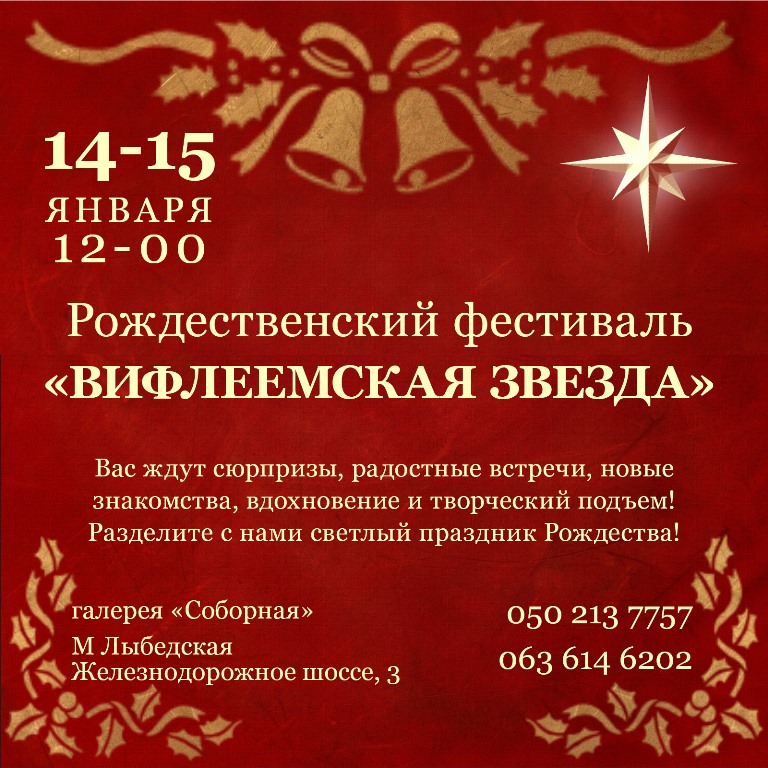 Два дні, 14 та 15 січня, триватиме традиційний VI Різдвяний фестиваль «Вифлеємська зірка» при Кафедральному соборі УПЦ на честь Воскресіння Христового в Києві. «На вас чекають сюрпризи, радісні зустрічі, нові знайомства, натхнення та творчий підйом!» – пишуть організатори. Відкриття фестивалю відбудеться о 12.00. Вхід вільний.