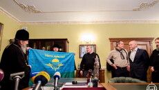 Старший лейтенант Сергій Білошицький, який у складі 90-го окремого аеромобільного батальйону захищав Донецький аеропорт, подякував Його Блаженству за звільнення його товариша по службі Тараса Колодія та передав Предстоятелю подарунок.