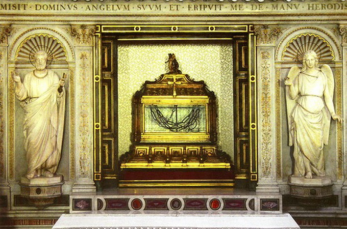 Вночі, напередодні суду над ним, Ангел Господній зняв з апостола ці ланцюги і у чудесний спосіб вивів його з темниці. Християни, почувши про чудо, взяли вериги (ланцюги) і зберігали їх як коштовність.