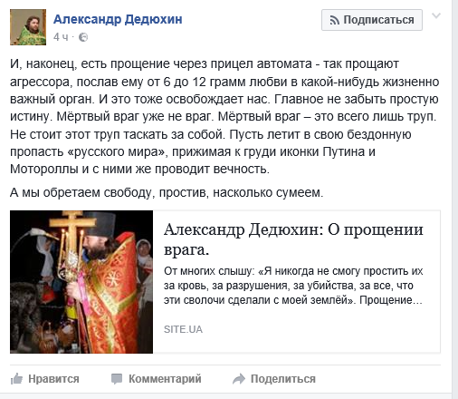 «Прощення – адже воно таке різне буває, – пише священик. – Є прощення через приціл автомата – так прощають агресора, пославши йому від 6 до 12 грамів любові у який-небудь життєво важливий орган. І це теж звільняє нас».