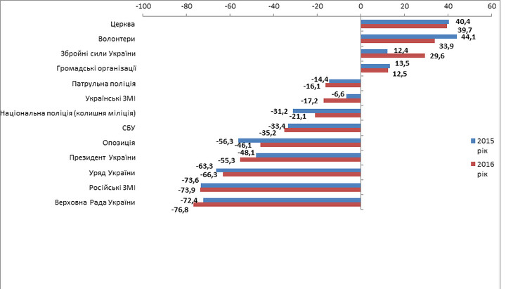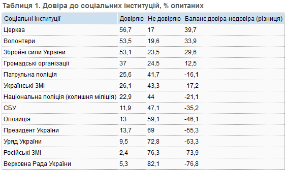Крім Церкви, довірою серед українців користуються волонтери та збройні сили України, а найменшим ступенем довіри – уряд України і Верховна Рада України (цим інститутам довіряє менше 10% українців).