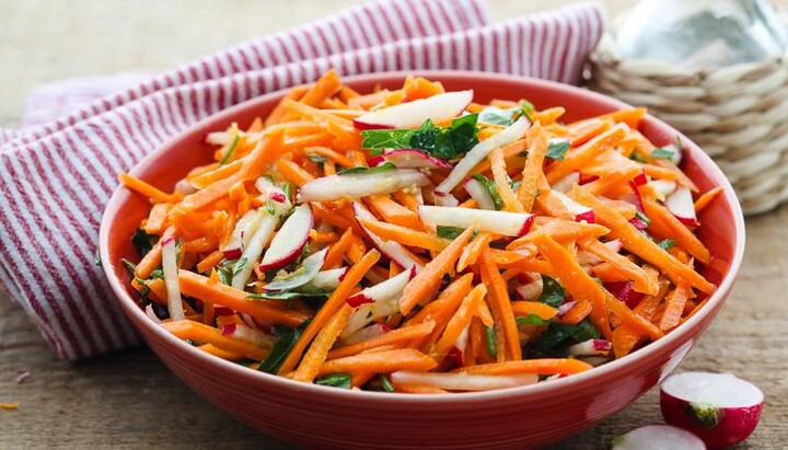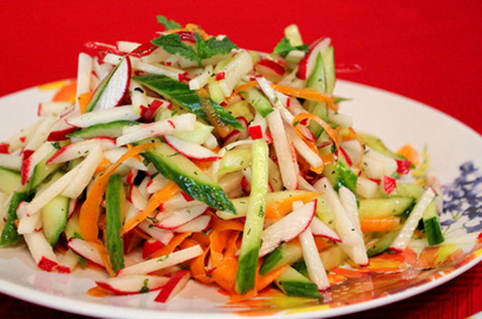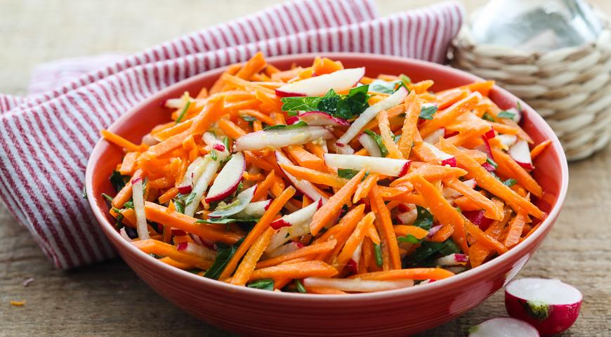 Редис та моркву промити, очистити, нарізати тонкою соломкою, посолити та залишити на 5 -10 хвилин.