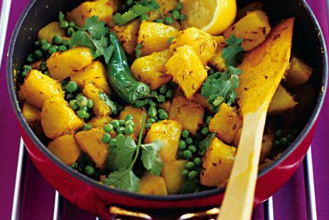 Додати до горошку картоплю й тримати на вогні, поки рідина не випарується. Посолити, поперчити, змішати з дрібно нарізаною петрушкою.