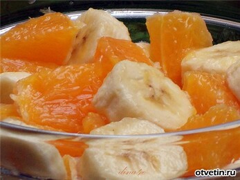 У розрізи бананів вставити, по черзі, скибочки ківі, лимона і апельсина.
