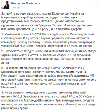 «Записуйте номери військових частин Збройних сил України та Національної гвардії, де начальство відкрито співпрацює з представниками Московської Патріархії». Як видно далі з замітки, йдеться про УПЦ, а не про РПЦ, як написав автор.