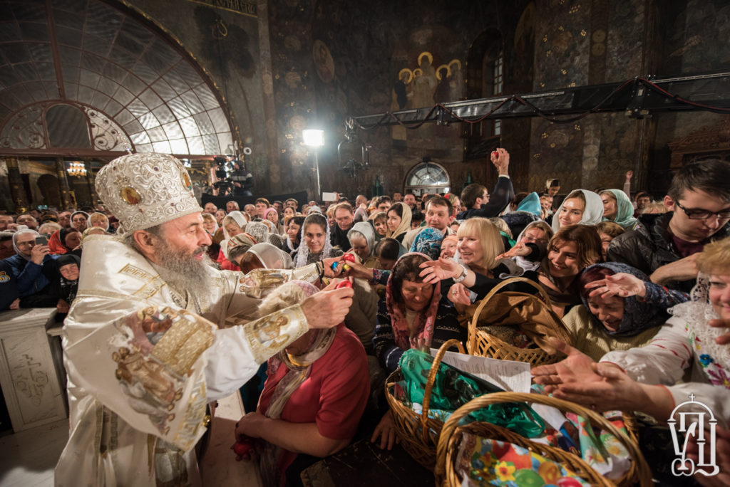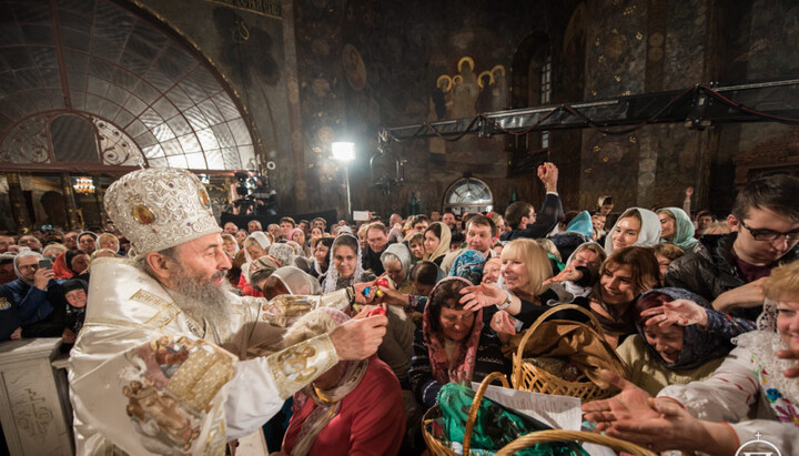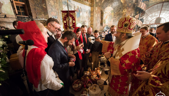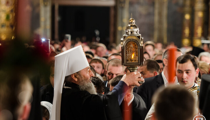 Перед початком пасхальної полуношниці Архіпастир роздав віруючим Благодатний Вогонь, який був доставлений у Велику Суботу з Єрусалиму в Україну офіційною делегацією УПЦ.