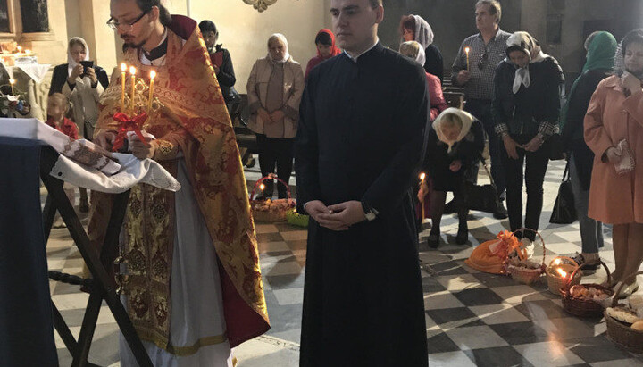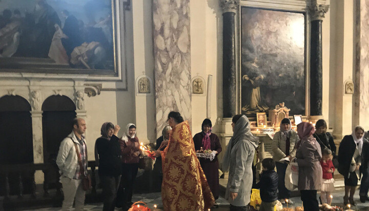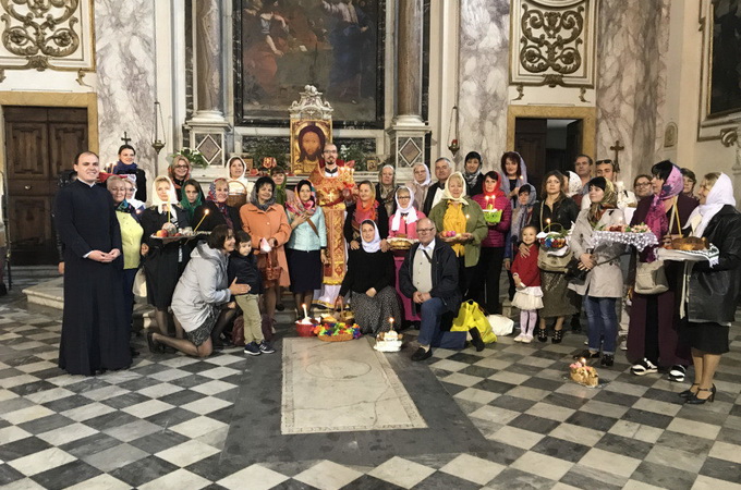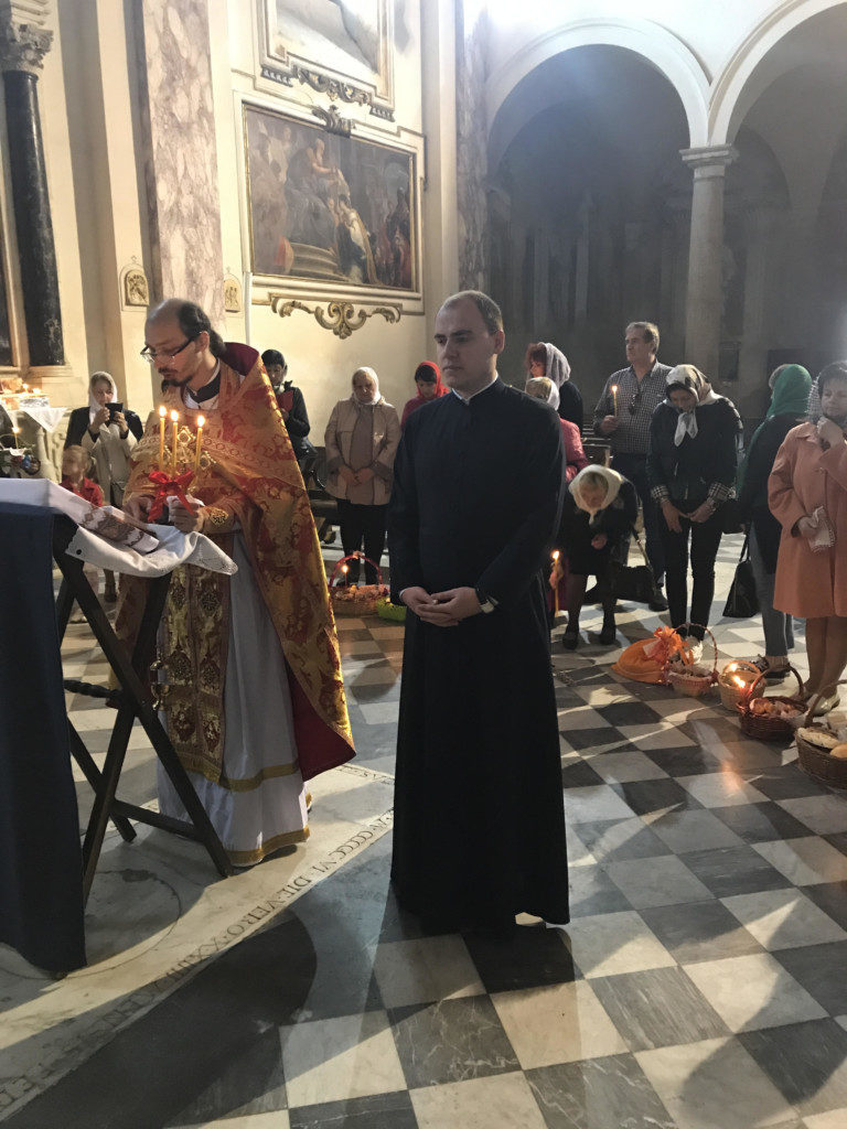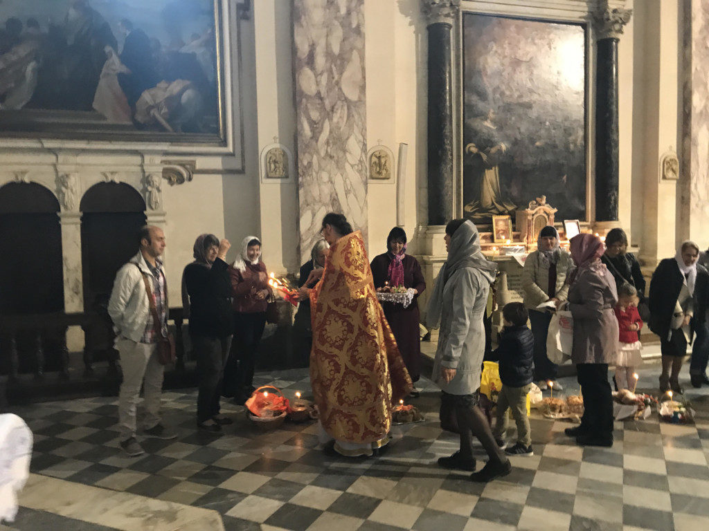 Після богослужіння священик привітав віруючих зі святом Світлого Христового Воскресіння, освятивши паски, а також поспілкувався з нашими співвітчизниками, які висловили радість та вдячність як за організацію громади, так і за можливість зустріти свято Світлого Христового Воскресіння у молитві та участі в Таїнствах Церкви.