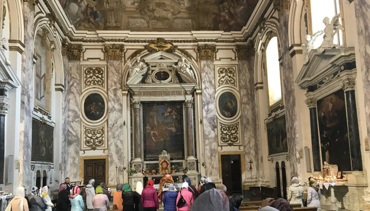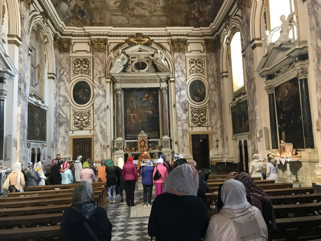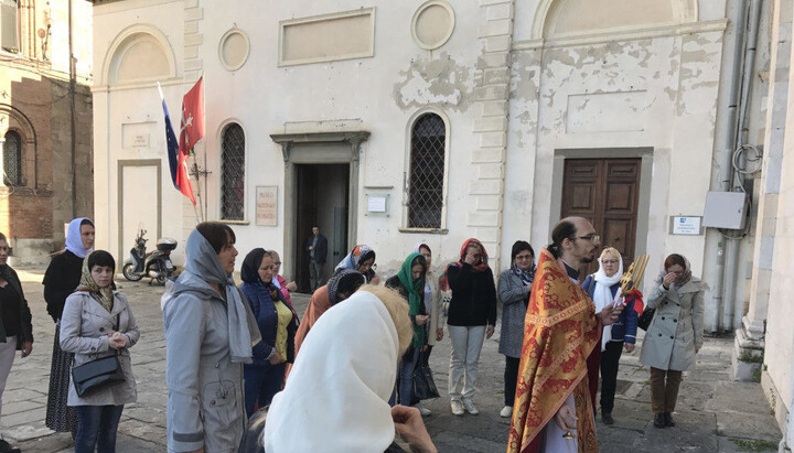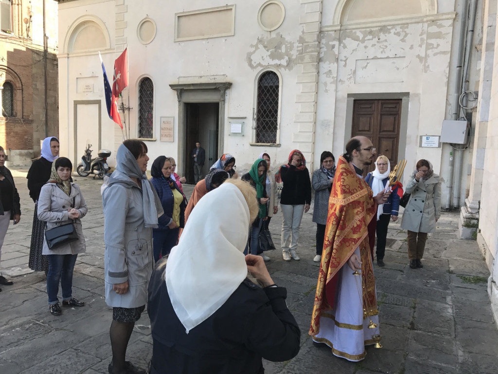 Перша Літургія відбулася 9 квітня, у свято Входу Господнього в Єрусалим в приміщенні храму Сан Маттео, яке було надано місцевою католицькою єпархією. У богослужінні взяли участь близько 30 віруючих з різних куточків України. Богослужіння звершив клірик Київської єпархії священик Ярослав Стрілець, якому допомагав співробітник ВЗЦЗ УПЦ В.В. Горзов.