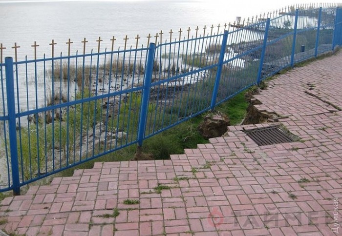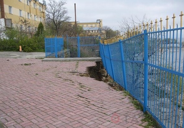 На даний момент небезпечну ділянку обгородили попереджувальною стрічкою, а паркан повис над кручею.