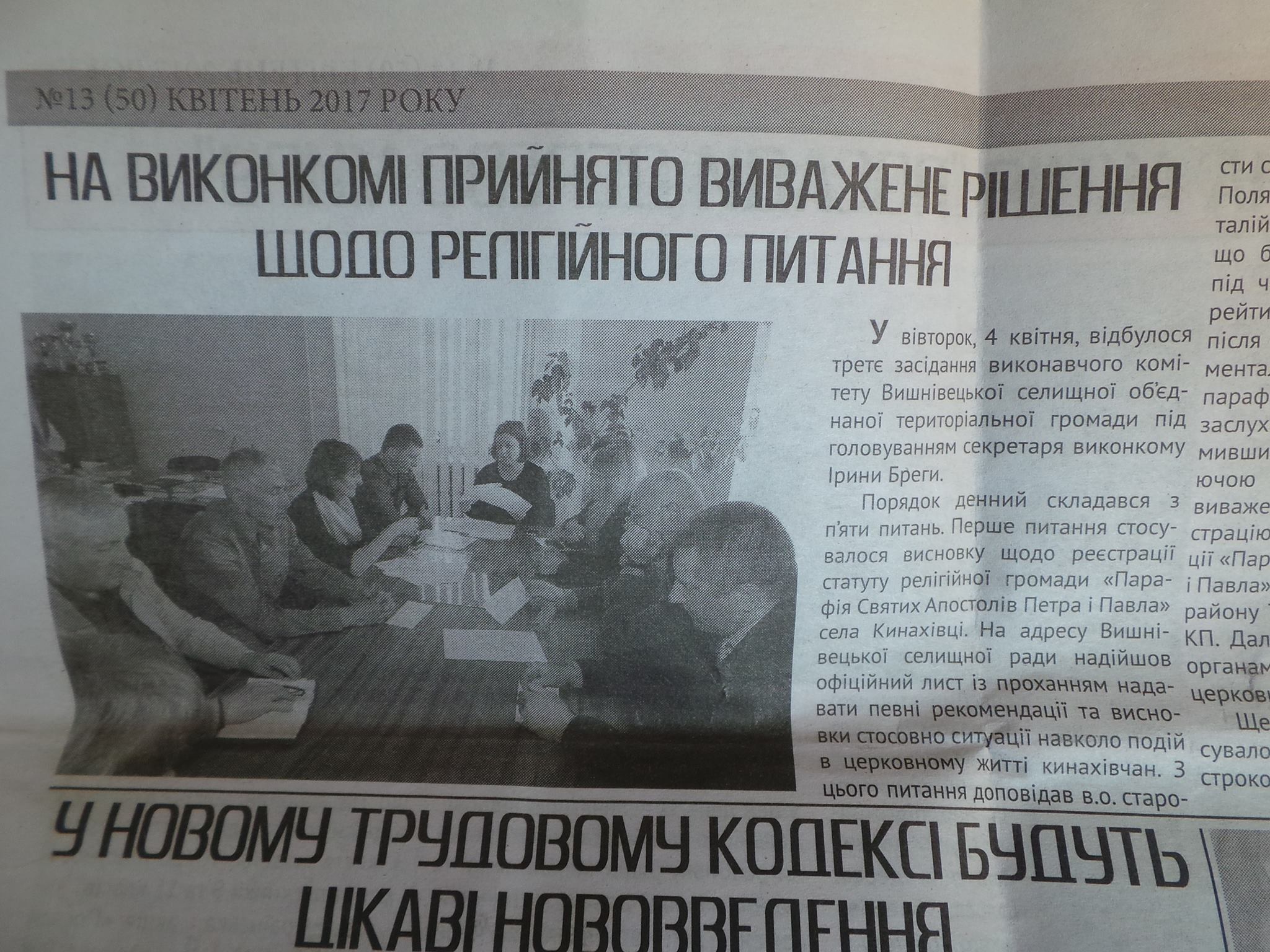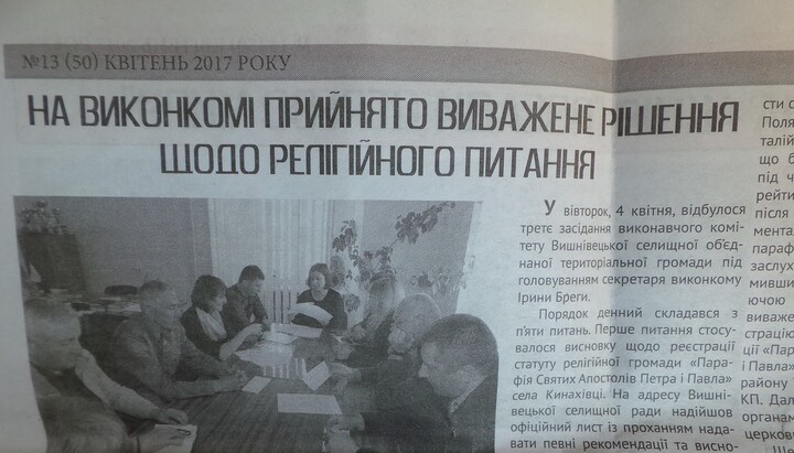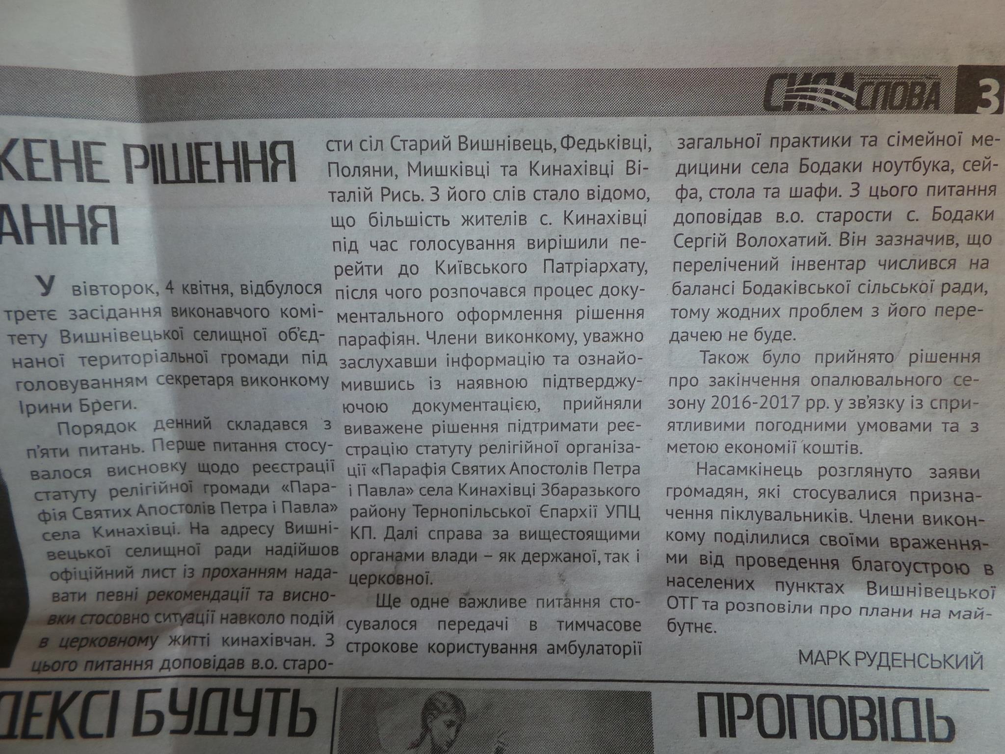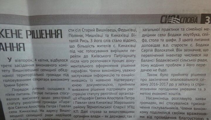 У розпорядження редакції потрапив випуск газети «Сила слова» за квітень 2017 року, в якому вийшов матеріал про засідання виконкому Вишневецької об'єднаної селищної територіальної громади, де йшлося про «перехід» жителів села Кинахівці у Київський патріархат. В тексті йдеться про те, що на основі «переходу» вирішено підтримати реєстрацію статуту осередку УПЦ КП у Кинахівцях.