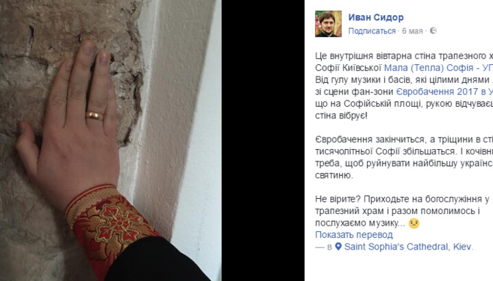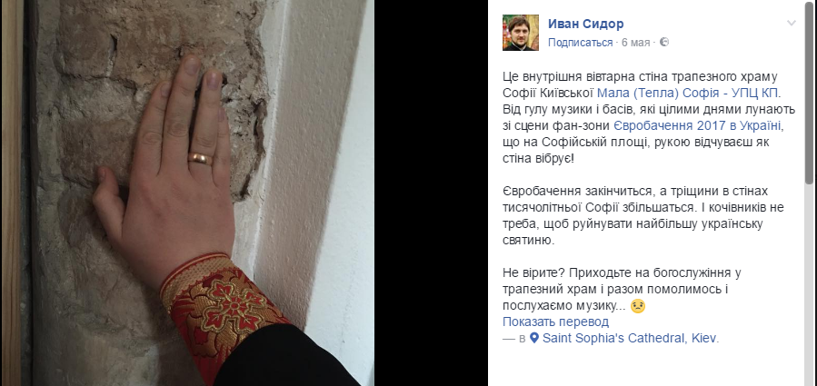 «Від гулу, музики і басів, які цілими днями лунають зі сцени фан-зони Євробачення 2017, рукою відчуваєш, як стіна вібрує, – написав Сидор. – Євробачення закінчиться, а тріщини в стінах тисячолітньої Софії збільшаться. І кочівників не треба, щоб зруйнувати найбільшу українську святиню».