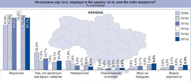 Невіруючими себе вважають 4,1% громадян, 2,5% – переконаними атеїстами. Про байдужість до релігійних питань заявили 8,2% респондентів, 6,3% вагалися з відповіддю.
