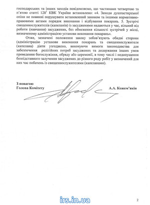 Відповідь за підписом Голови Комітету ВР Андрія Кожем'якіна була підготовлена за результатами розгляду звернення душпастирської ради при Державній пенітенціарній службі України.