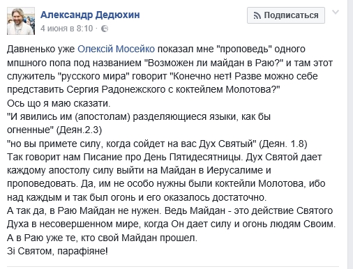 «Дух Святий дає кожному апостолу силу вийти на Майдан в Єрусалимі і проповідувати. Так, їм не надто потрібні були коктейлі Молотова, бо над кожним і так був вогонь, і його виявилося достатньо.