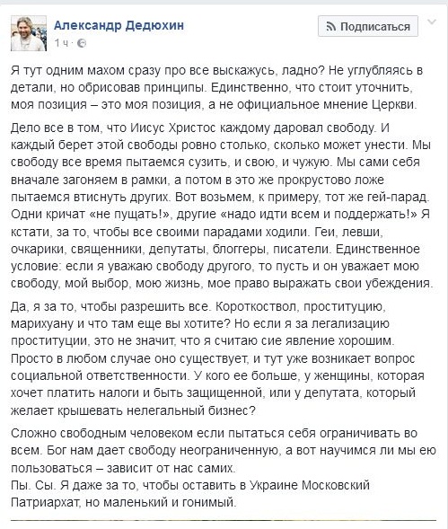 Олександр Дедюхін навіть згоден «залишити» в Україні УПЦ. Але при цьому обмовився, в якій саме якості: «маленьку і гнану».