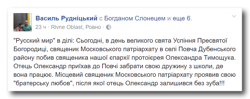«"Русский мир" в ділі: Сьогодні, в день великого свята Успіння Пресвятої Богородиці, священик Московського патріархату в селі Повча Дубенського району побив священика нашої єпархії протоієрея Олександра Тимощука, – написав у Facebook Василь Рудніцький, прес-секретар Рівненської єпархії УПЦ КП. – Отець Олександр приїхав до Повчі забрати свою дружину з школи, де вона працює. Місцевий священик Московського патріархату проявив свою "братерську любов", після якої отець Олександр залишився без зуба!!»