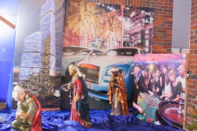 В костелі м. Гродно встановили різдвяний вертеп, у якому Святе Сімейство розташували на тлі сирійських біженців, дорогих автомобілів, казино та хмарочосів. Про це повідомляє Белсат.