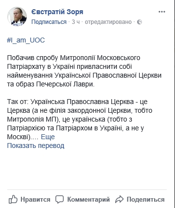 «Побачив спробу Митрополії Московського Патріархату в Україні привласнити собі найменування Української Православної Церкви та образ Печерської Лаври», – пише Є. Зоря.