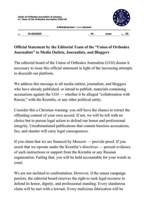 10 червня 2025 року головний редактор американського відділення «Спілки православних журналістів» Бенджамін Діксон виступив з офіційною заявою у відповідь на посилення спроб дискредитувати ресурс.